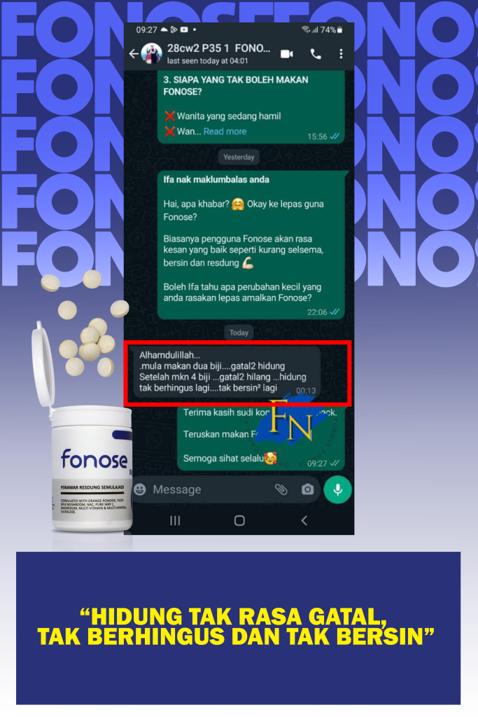 • Tetapi saranan kami untuk anda terus konsisten mengamalkan pemakanan Fonose ini kerana produk ini bukan hanya memfokuskan kepada masalah Resdung sahaja tetapi boleh menembuhkan penyakit-penyakit lain kerana telah